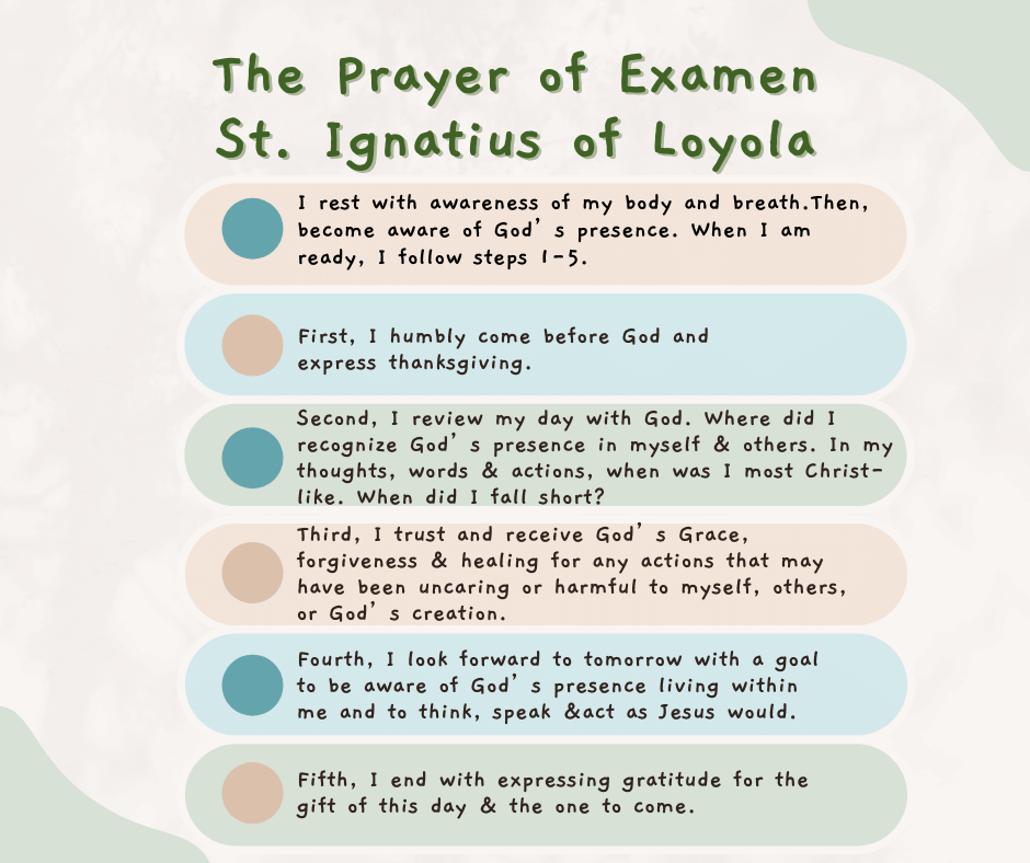 I want to introduce you to the The Prayer of Examen. It is a prayer form developed by St. Ignatius of Loyola (1491–1556) as part of his work on “spiritual exercises.” There are 5 points to this prayer.